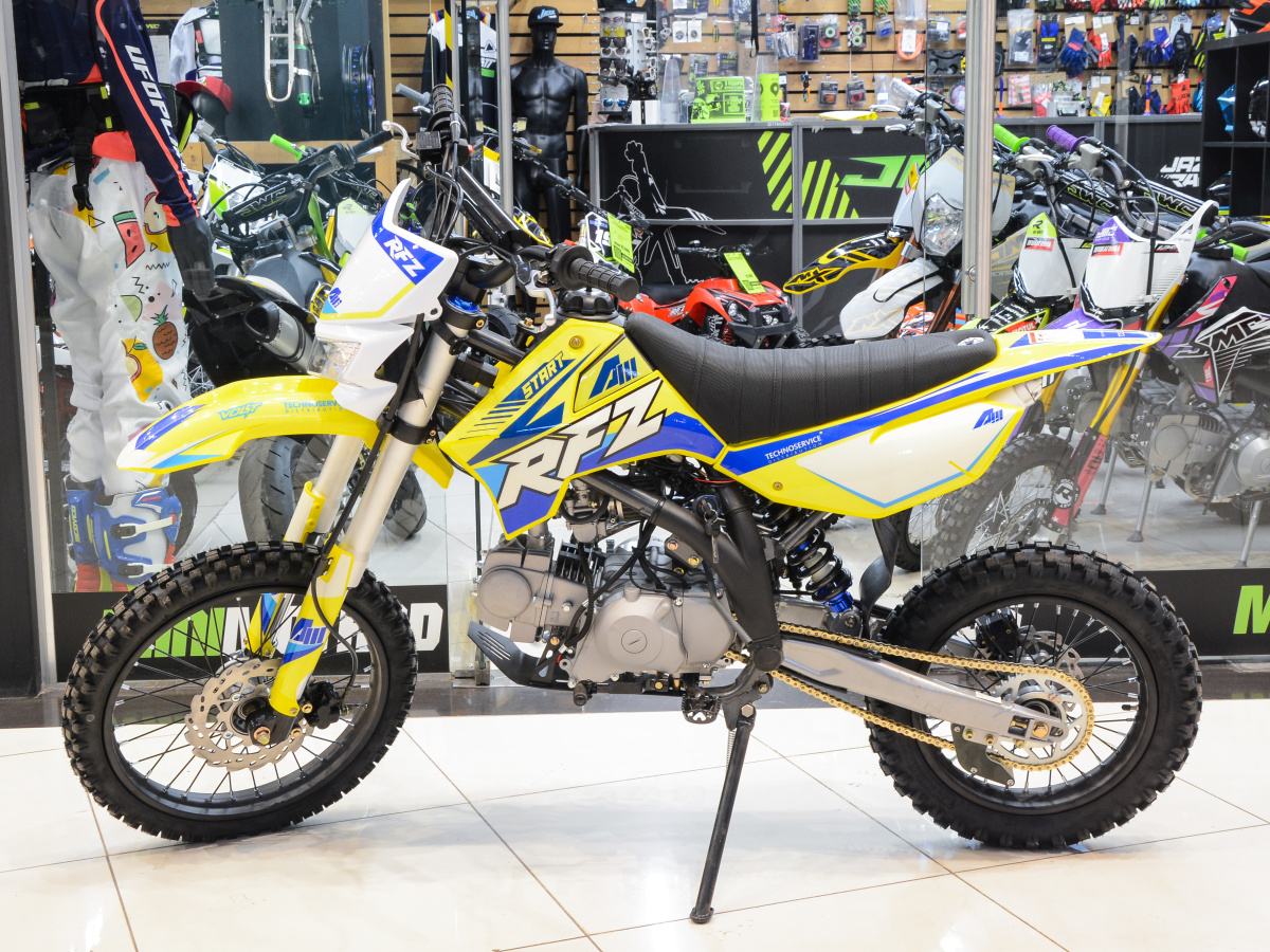 Питбайк от легендарного Французского бренда Apollo. В разработке любой техники этой компании участвуют в первую очередь не маркетологи, а инженеры и мотокросмены. Это чувствуется в каждой детали, начиная от рамы и заканчивая двигателем. Везде прослеживается внимание к деталям. Питбайк Apollo RFZ START 125LE 17/14 желтого цвета не стал исключением из этих правил. Рама AGB-37, трубчатая, стальная - с хорошими показателями прочности и выносливости. Для защиты двигателя установлена стальная защита VOLT,  благодаря которой одноцилиндровый, 4-тактный YX будет в безопасности и встречные ветки, камни и прочее ему не помеха. Двигатель работает в паре с одним из самых проверенных и надежных карбюраторов. Коробка передач выбрана классическая механическая 4 ступенчатая с нейтральной передачей в самом низу - очень удобное решение. Рама RFZ стала больше и колесная база увеличилась. Посадка стала комфортнее, устойчивость и управляемость возросли в разы. Рычаги управления сцеплением и тормозом установлены от старшей модели RXF. Колеса 17/14 (переднее 70/100-17, заднее 90/100-14). Подвеска так же претерпела ряд изменений: передняя VOLT V-ONE 750 мм, а задняя VOLT V-ONE - 320 мм. Сиденье стало более комфортным и мягким. Питбайк Apollo Start 125LE 17/14  - подойдет как для начинающих так и для более опытных райдеров. Для удобства эксплуатации в темное время суток, установлена фара. В модели помимо кикстартера установлен так же электростартер, а это сильно облегчит жизнь, когда при покорение горы или болота питбайк случайно заглохнет. Нажали кнопочку, он завелся и снова готов покорять любые  препятствия на своем пути.