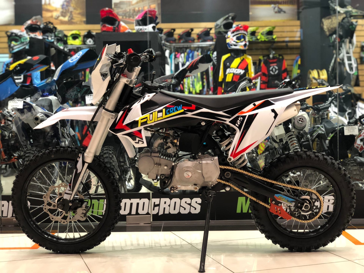 Питбайк от молодого российского бренда Full Crew, модель получилась название FC125 17/14. В ней собраны все ключевые моменты для покорения сердца питбайкера. Трубчатая стальная рама, дисковые гидравлические тормоза, надежный и проверенный временем двигатель YX 125 с механической четырехступенчатой коробкой передач и фара. А самый огромный плюс – это демократичная цена и наличие электростартера на питбайке Full Crew FC125 17/14 белый.
